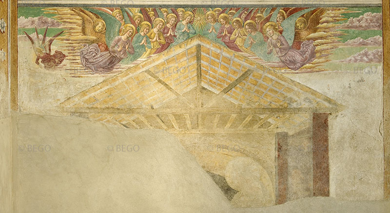 Sulla parete destra si intuisce un'elegante prospettiva architettonica che doveva far da quinta alla scena con la Visitazione di Maria ad Elisabetta, già descritta dalle fonti ottocentesche; si prosegue quindi con il racconto della Natività di Cristo - del quale non rimane che qualche frammento della capanna sovrastata dagli angeli in gloria - e sul lato sinistro con la pressoché perduta Adorazione dei Magi.
